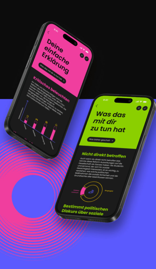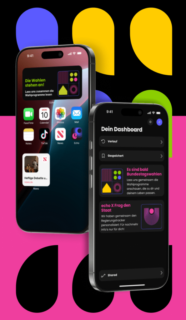 At the NEULAND Award, echo was recognised for its clear focus on political opinion formation and its accessibility for a young audience. The jury highlighted the app’s consistent design approach tailored to this target group and its striking visualisation of the diversity of individual opinion-forming processes. They also praised the neutral concept, which helps young people find their own position in politically uncertain times.